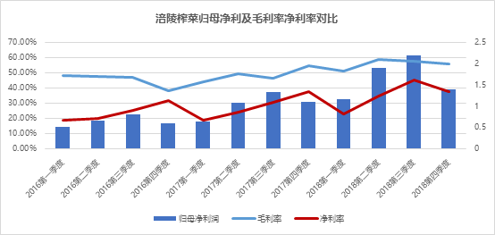 涪陵榨菜的提價對毛利率和凈利率貢獻是巨大的。主要也體現在四季度上,毛利率同比增長16.43%,首次突破50%,達54.34%,創出階段歷史新高。