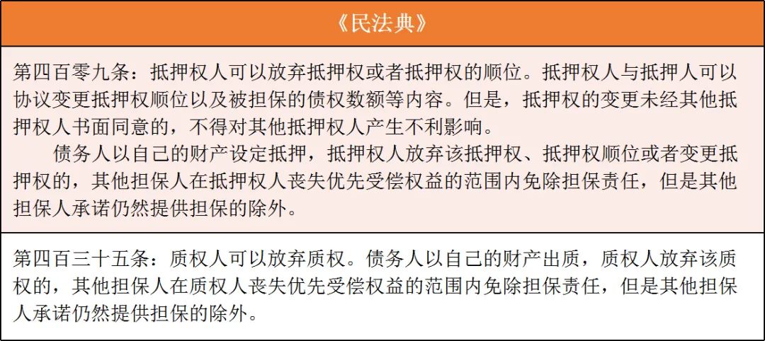 (3)放棄擔(dān)保權(quán)利免責(zé):抵押權(quán)人放棄抵押權(quán)、抵押順位或者變更抵押權(quán),質(zhì)權(quán)人放棄質(zhì)權(quán),都會(huì)產(chǎn)生因放棄擔(dān)保權(quán)利而使擔(dān)保人免除相應(yīng)擔(dān)保責(zé)任的法律后果,但是擔(dān)保人承諾仍然提供擔(dān)保的除外。法條鏈接: