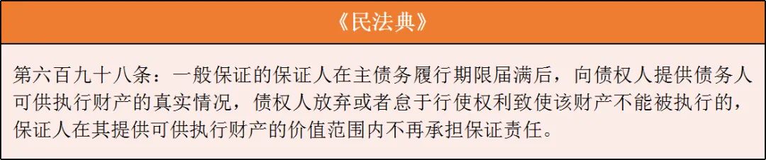 (1)未先執(zhí)行債務(wù)人財(cái)產(chǎn)免責(zé):一般保證人專屬有先訴抗辯權(quán),是指一般保證的保證人在就債務(wù)人的財(cái)產(chǎn)依法強(qiáng)制執(zhí)行仍不能履行債務(wù)前,對債權(quán)人可以拒絕承擔(dān)保證責(zé)任的權(quán)利,法律同時(shí)也設(shè)定了限制一般保證人行使先訴抗辯權(quán)的情形,此次《民法典》對一般保證人不得行使前款權(quán)利的情形做了較大調(diào)整。法條鏈接:
