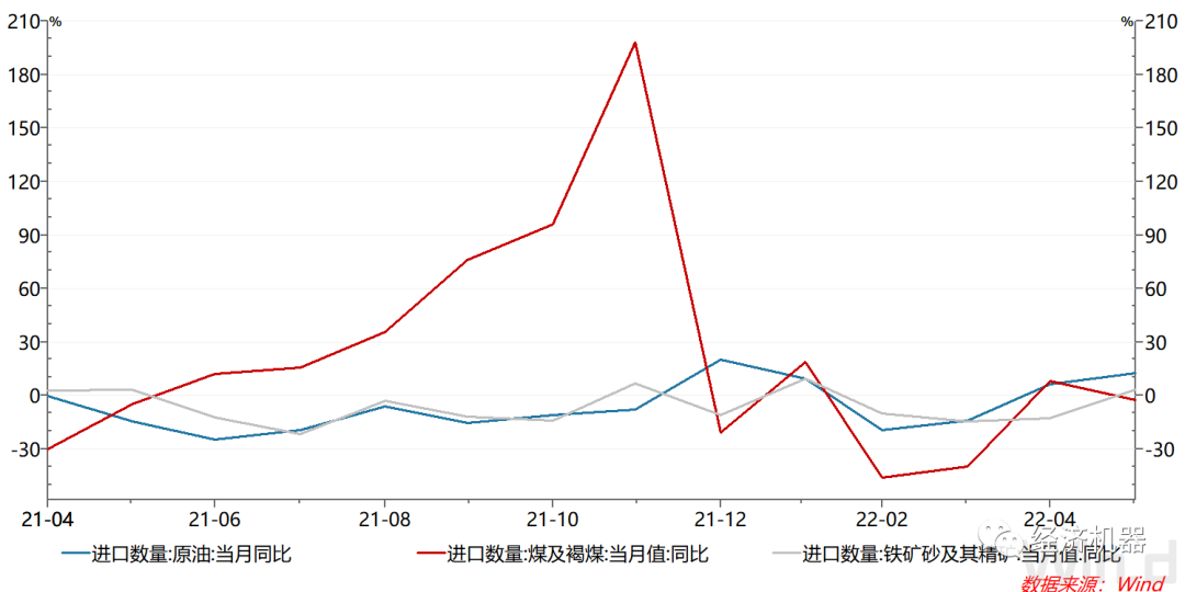 進口超預期,原油、鐵礦石進口量增速持續提升。隨著進口的大幅改善,,較上月4.1個百分點,顯著好于0.6其中主要商品中,原油、鐵礦砂進口量增速分別為12.57%,3.15%,較上月提升6和15.8個百分點。煤進口量增速為-2.35%,較上月回落10.7個百分點(圖4)。