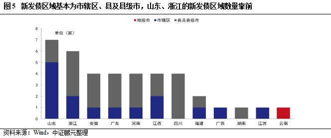 新發債區域基本為市轄區、縣及縣級市,大部分區域一般預算財政實力較弱,新發債區域的新主體級別大部分為AA級,另外有較多為AA-及以下與未披露級別的平臺