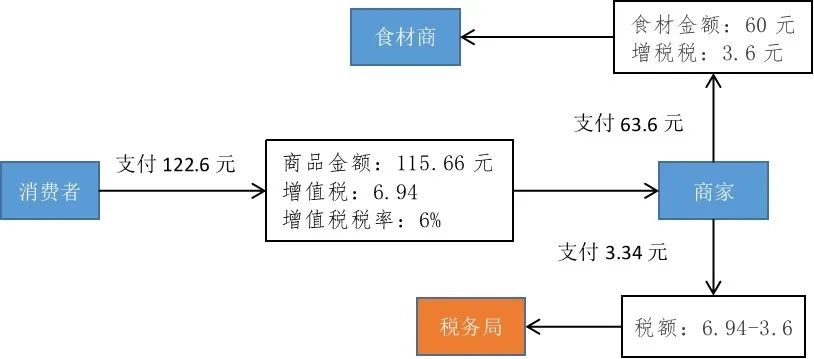 以日常生活中的餐飲為例,在消費結束后開具增值稅發票,發票金額中經常會出現三個金額,如下圖所示,作為消費者最終要支付的金額為122.6元。但通過發票可以看出,其組成結構為兩部分:即115.66元+6.94元。115.6元是餐飲服務實際發生的金額;6.94元是伴隨這項消費產生的增值稅。