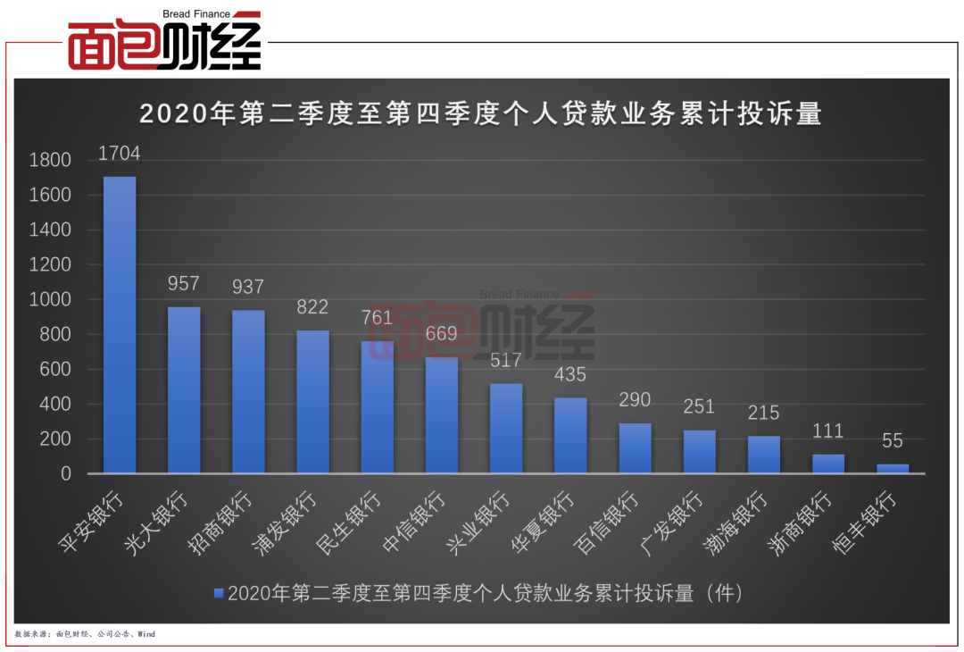數據顯示,2020年第二至第四季度,股份制商業銀行個人貸款業務投訴量的中位數分別為128件、230件和196件。平安銀行的投訴量已經遠超中位數水平。三個季度個人貸款業務投訴量累計達1704件,高居股份制銀行之首。