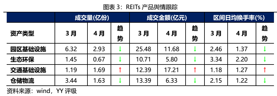 4月延續三月回調趨勢,按資產類型看,園區基礎設施、生態環保以及倉儲物流類REITs的成交額、成交量及日均換手率較3月均有大幅下降,只有交通基礎設施類REITs較三月有一定上漲。價格走勢來看,11只公募REITs產品在4月中上旬有一定上揚,但下半月回調明顯,整體呈下跌走勢。