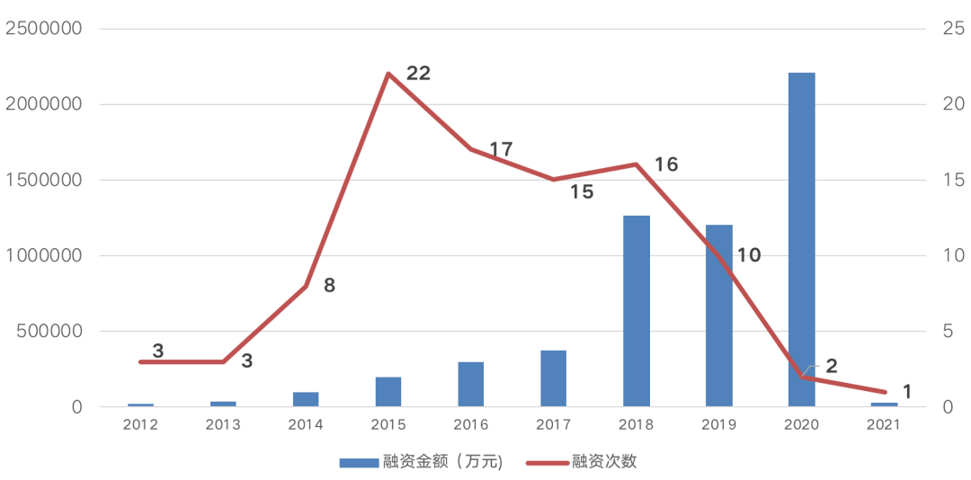 從2012-2021年住房租賃市場公開股權融資事件及金額變化趨勢來看,從2017年開始,住房租賃市場融資事件數量持續下降,但融資總額持續走高。