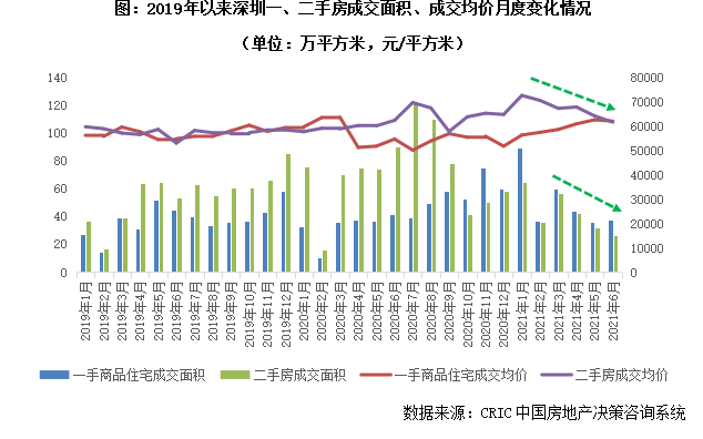 據CRIC監測數據,自深圳新政發布以來,二手房成交量節節下滑,2021年6月單月僅成交26萬平方米,處于近年來歷史低位;上半年整體二手房成交量僅為257萬平方米,同比降幅達36%,可見新政對二手房市場的“殺傷力”比“新冠疫情”還要猛烈。二手房成交均價如是,在“指導價”出臺后,整體成交均價穩步回落,至6月末已低于新房成交價格,“一二手倒掛”不復存在。