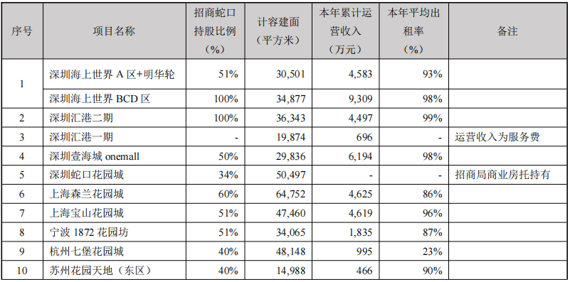 報告期間內,招商蛇口擁有可出租土地面積 139.84萬平米,出租率98%,報告期出租收入 1.00億。