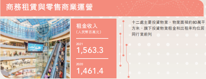 商務租賃與零售商業運營方面,相關項目的運營收入為15.633億元,占總收入的2%,同比增長7%。各寫字樓項目租賃情況良好,出租率基本保持高位。零售商業方面,受疫情影響,雖然營業業績有所增長趨勢,但客流較疫情前仍有差距。