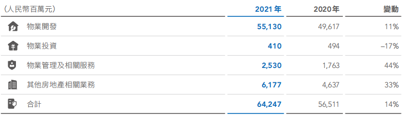 營業收入中,來自房地產開發及相關資產經營業務的營業收入為4,299.3億元;來自物業服務的營業收入為198.3億元。
