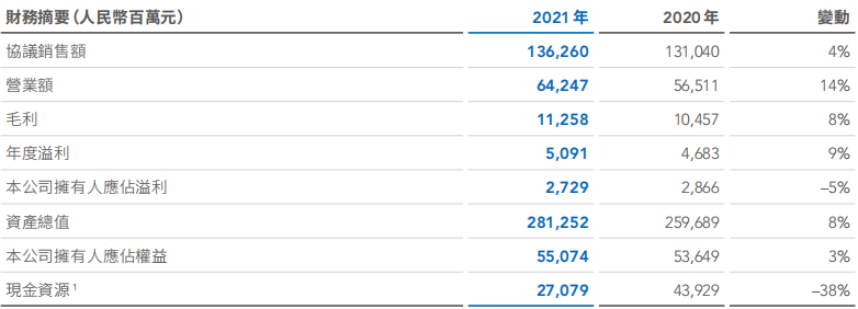 報告期間內全年營業收入約為人民幣573.8億元,同比上升24.1%;核心凈利潤約為人民幣41.5億元,同比上升3.2%。毛利率為21.8%,同比下降3.3個百分點。