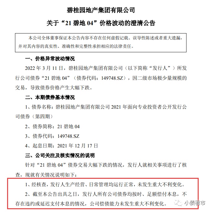 3月14日,碧桂園地產集團有限公司(以下簡稱“碧桂園地產”)發布關于“21碧地04”價格波動的澄清公告。