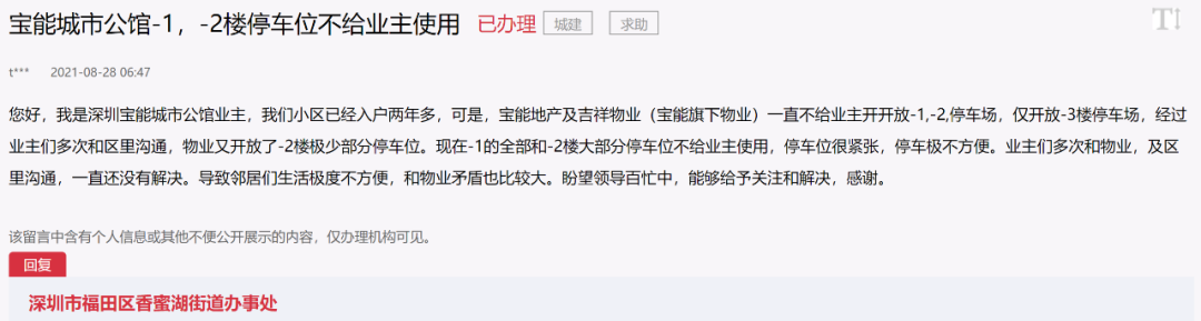 業主在領導留言板投訴稱,小區銷售時承諾1:2的車位配比,但入住小區兩年多,直到2021年寶能地產及吉祥物業(寶能旗下物業)一直不給開放-1和-2停車位,物業曾經在負一負二層車位焊了卷閘門。后經過協商才開放了極少部分。