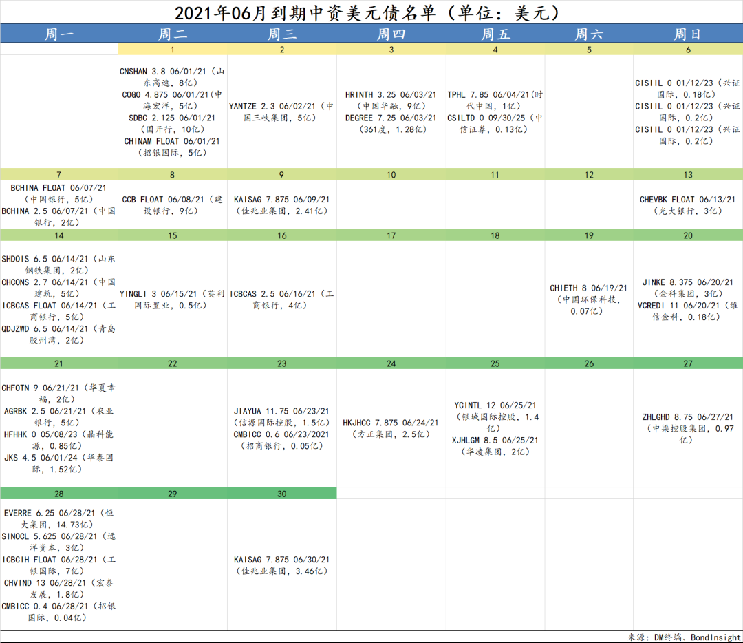 據DM終端統計,6月面臨到期兌付或回售到期的中資美元債共計42只,信用主體數量相較5月有所上升,待償金額合計約135.95億美元,較四月待償還規模增加18.74%。其中特別值得關注的主體有中國華融、恒大地產、佳兆業集團等。