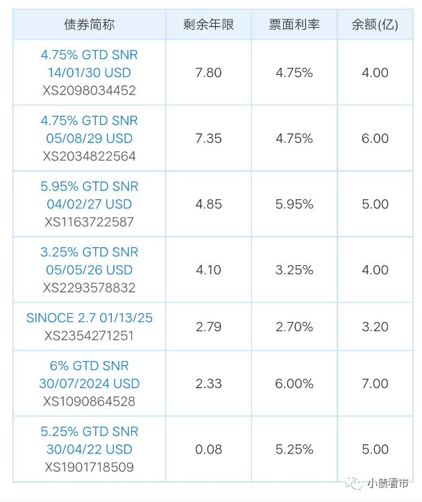 遠(yuǎn)洋集團(tuán)則存續(xù)8只美元債,存續(xù)規(guī)模42.2億美元,今年4月30日將有一只5億美元債到期。