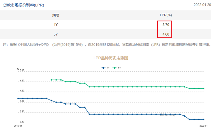 截至4月20日最新一期的LPR數據,5年期及以上貸款利率為4.6%,下浮20個基點,則為4.4%。