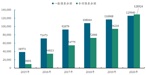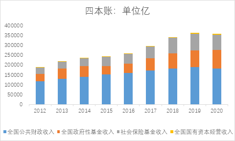 此外,如果我們再看財政支出來看,同樣以4本賬衡量的支出規模2020年在44.50萬億(同樣會有重復加總的問題),剔除掉重復的部分,簡單來看赤字規模也在4-5萬億體量。