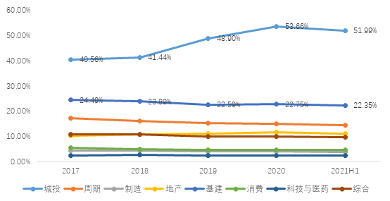 由于數據缺失,我們繼續缺失,通過發債主體(這里是以偏概全,數據會低估)針對行業大類拆分,可以來看細分行業的杠桿率攀升:假設隱性債務限定領域在融資平臺和基建投放上,兩者累計杠桿率到74%;而城投更多衡量的地方視角的債務、基建衡量的是中央層面的項目。