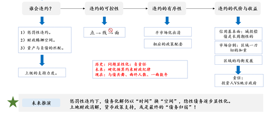 由于城投非市場化的定位,起處置和政策的起伏高度相關,這個環節我們聚焦以下幾個點展開:政策的邊界和預期、歷史包袱(窟窿)怎么辦、哪些會被點狀出清、高收益階段性盛宴機會。