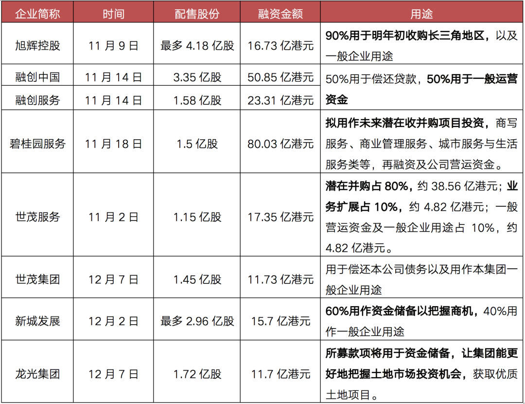 除此之外,旭輝和新城發(fā)展以股東托底的供股方式進(jìn)行,11月9日旭輝控股配售最多4.18億股,募集金額約16.73億港元,其中90%用于明年初收購長三角地區(qū),以及一般企業(yè)用途;12月2日新城發(fā)展配售最多2.96億股,募集金額約15.7億港元,其中60%用作資金儲(chǔ)備以把握商機(jī),40%用作一般企業(yè)用途。