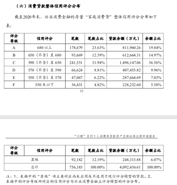 報告中還披露了興業(yè)消費金融消費貸款整體信用評分分布情況。興業(yè)消費金融目前使用的內部評分,主要以客戶是否逾期作為因變量,客戶畫像特征作為自變量,運用邏輯回歸技術擬合和預測新客戶的違約可能性,總分區(qū)間在400- 700之間,評分越高,違約概率相對越低。