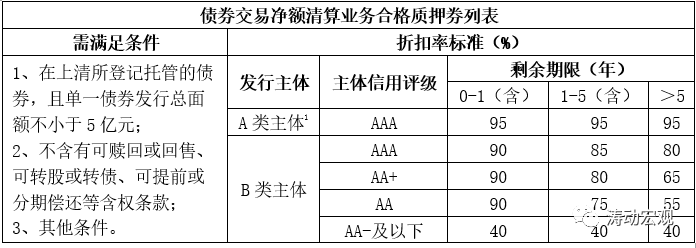 (1)2016年8月24日,上清所發(fā)布的《債券交易凈額清算業(yè)務(wù)質(zhì)押式回購(gòu)質(zhì)押券管理規(guī)程》明確上清所負(fù)責(zé)設(shè)定可納入通用質(zhì)押券業(yè)務(wù)的合資格債券標(biāo)準(zhǔn),合資格債券折扣率根據(jù)主體信用水平、債券剩余期限、價(jià)格波動(dòng)和市場(chǎng)流動(dòng)性等設(shè)定。其中,質(zhì)押券價(jià)值=債券總面額累計(jì)*全價(jià)估值*折扣率/百元剩余本金。
