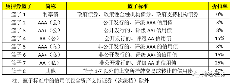 (3)2018年4月24日,上交所與中國(guó)清算聯(lián)合發(fā)布《債券質(zhì)押式三方回購(gòu)交易及結(jié)算暫行辦法》,明確三方回購(gòu)的正回購(gòu)方限于金融機(jī)構(gòu)、公募證券投資基金和商業(yè)銀行的理財(cái)產(chǎn)品。同時(shí)在業(yè)務(wù)開(kāi)展初期,擔(dān)保品按債券類(lèi)型、發(fā)行方式和債券評(píng)級(jí)劃分為8個(gè)質(zhì)押券籃子,具體劃分標(biāo)準(zhǔn)及折扣率如下: