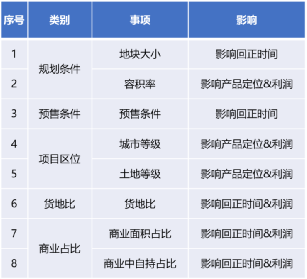 規劃條件、預售條件、項目區位、貨地比、商業占比,這五個因素中對利潤影響最大的因素和我們的以往的認識不同,但是對現金流的影響是比較直接的。