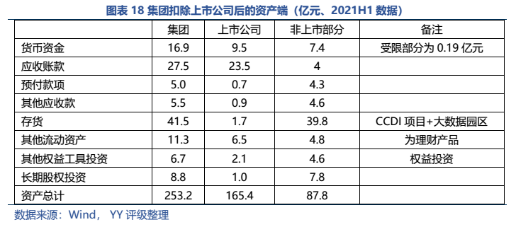 而集團除去非上市公司部分資產(chǎn)主要集中在CCDI產(chǎn)業(yè)園項目和大數(shù)據(jù)園區(qū)綜合體項目,母公司資產(chǎn)主要為對上市公司的長投、和對文創(chuàng)置業(yè)(產(chǎn)業(yè)園項目的建設主體)的應收款。最悲觀來看,市場擔憂成真,上市公司被無償劃出、大數(shù)據(jù)綜合園區(qū)項目后續(xù)去化乏力,公司還能獲得CCDI項目的政府補貼、加上已預售的回款和貨幣資金及理財產(chǎn)品,大致能覆蓋母公司層面有息債務;樂觀來看,若上市公司還在集團手里(或轉(zhuǎn)移獲得一定對價),則能大幅減少償債壓力。