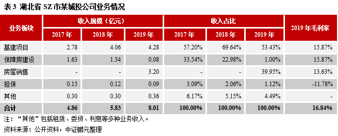(4)風險提示:隨著地方政府隱性債務(wù)風險越來越受到中央重視,城投公司的處境也越來越難,“信仰”的光環(huán)越來越趨于淡化。為了謀生存,城投公司一方面必須盡全力保持自身在公益/準公益領(lǐng)域的區(qū)域?qū)I性,以強化城投屬性并爭取獲得更高概率、更大力度的政府支持;另一方面城投公司還不得不做一些市場化業(yè)務(wù)的拓展和培育,以強化自身作為一個企業(yè)實體的造血能力、盈利能力。這種背景下,不管是否具備充分的條件,城投公司都或多或少地會去涉足一些市場化業(yè)務(wù),而經(jīng)驗的不足、團隊的不專業(yè)、市場開拓的阻力等都會加大業(yè)務(wù)運營風險,導(dǎo)致的后果就是:涉足了很多類型的市場化業(yè)務(wù),確實產(chǎn)生了一定規(guī)模的收入,但卻沒有真正形成新的主營業(yè)務(wù)板塊,單個板塊的收入規(guī)模占比很低,且毛利率存在異常(多數(shù)時候是負數(shù),有時候也可能高得離譜),因此在進行各業(yè)務(wù)板塊收入成本情況的統(tǒng)計分析時只好將眾多“不成氣候”的市場化業(yè)務(wù)歸于“其他”一類,表面上看收入規(guī)模不小,但其在擴充公司總體營業(yè)收入規(guī)模的同時,背后也可能潛藏了相當多的風險。舉個例子,一家城投公司將酒店運營作為市場化業(yè)務(wù)的其中一個發(fā)力點,但酒店業(yè)的初始投資規(guī)模很大,后續(xù)還會產(chǎn)生較大的翻修成本,同時酒店業(yè)的投資回報期是比較長的,而且也很難一直保持旺季時的高入住率,所以短期內(nèi)考慮攤銷折舊之后酒店運營板塊極可能是虧損的。那么,對于該城投公司來說,酒店運營板塊除了對總體營業(yè)收入有一定貢獻外,實際上則增加了其資金壓力,弱化了其盈利能力,對強化償債保障反而產(chǎn)生了掣肘。