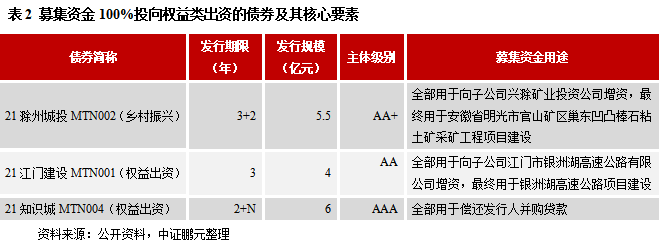 截至11月30日,存量權益出資型票據共計34只,規模336.5億元,其中城投公司發行的數量共計21只,規模190.5億元,共涉及18家發行主體。在上述18家城投公司中,AAA級、AA+級、AA級的數量分別為8家、9家、1家,對應的權益出資型票據存量規模分別為130億元、56.5億元、4億元,集中在高信用級別的特征尤為顯著。從募集資金用途來看,較多地集中在對子公司增資(并用作項目資本金)、償還并購貸款等,其中有3只債券(為中票)的募集資金100%投向權益類出資(詳見表2),有12只債券(為中票)中則有部分資金用于償還有息債務,剩余6只債券(為PPN)則未披露募集資金用途。從發行期限來看,考慮含權因素的話,最長期限是不確定期限,也即長期存續,但這種情況僅有兩例;不考慮含權因素的話,最長期限為5年,超八成均為3年期,低于理論預期水平,顯示投資者對更長期限權益出資票據的接受度不高。作為創新品種,其募集資金用于權益類投資,而權益類投資本身具有高風險性,這與債券投資者低風險偏好的特點相悖,這是5年以上甚至長期存續型權益出資票據較難發出來的根源所在。