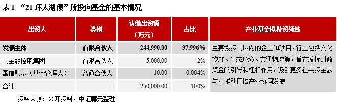 截至11月30日,存量基金債共計60只,規模746.92億元,其中城投公司發行的數量共計24只,規模255.21億元,共涉及17家發行主體。在上述17家城投公司中,AAA級、AA+級、AA級的數量分別為9家、6家、2家,對應的存量基金債規模分別為166.01億元、74.2億元、15億元,集中在高信用級別的特征十分顯著。從募集資金用途來看,較多地集中在對產業基金等出資、增資或繳納公司已成立基金的出資額,其中有19只債券的募集資金100%投向產業基金或直接用于股權投資(比如浙江省湖州市某縣級城投公司所發的8億元基金債——“21環太湖債”,詳見表1),剩余4只債券中則有部分資金用于補充營運資金或者投向建設項目。