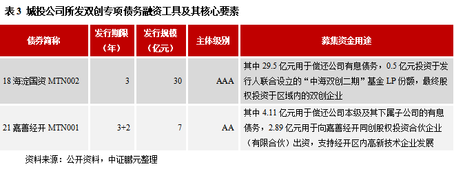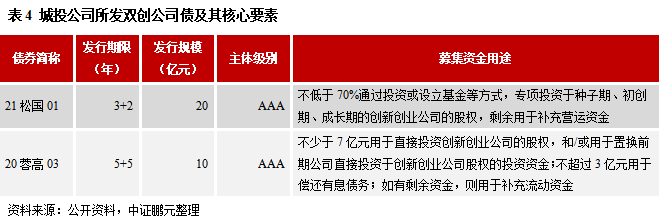 (2)城投公司可以選擇多個債券品種募集資金用于股權投資:一是基金債,截至目前城投所發行的存量基金債規模為255.21億元,共涉及17個主體;二是雙創孵化專項債,截至目前尚未有城投公司發行此類債券用于股權投資;三是權益出資型票據,截至目前城投所發行的存量債規模為190.5億元,共涉及18個主體;四是雙創專項債務融資工具,截至目前城投所發行的存量債規模為221.1億元,共涉及16個主體;五是雙創公司債券,截至目前城投所發行的存量債規模為102.35億元,共涉及12個主體;六是紓困專項公司債券,截至目前城投所發行的存量債規模為397.9億元,共涉及17個主體。