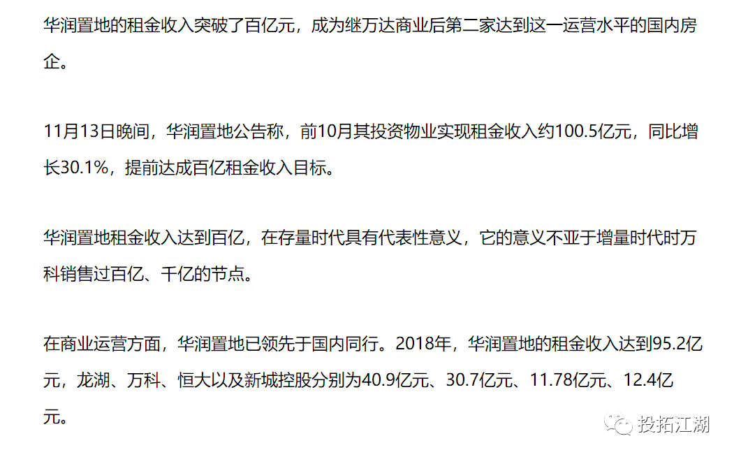 國(guó)內(nèi)關(guān)注存量資產(chǎn),做商業(yè)運(yùn)營(yíng)的優(yōu)秀代表,如華潤(rùn)置地的租金收入已破百億,未來的市場(chǎng)大有可期。