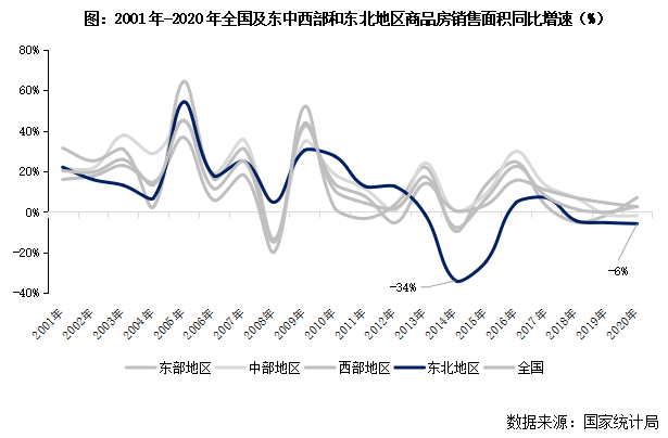 1、東北銷售面積增速自2010年來急跌緩增,2018年起連續(xù)3年負(fù)增長