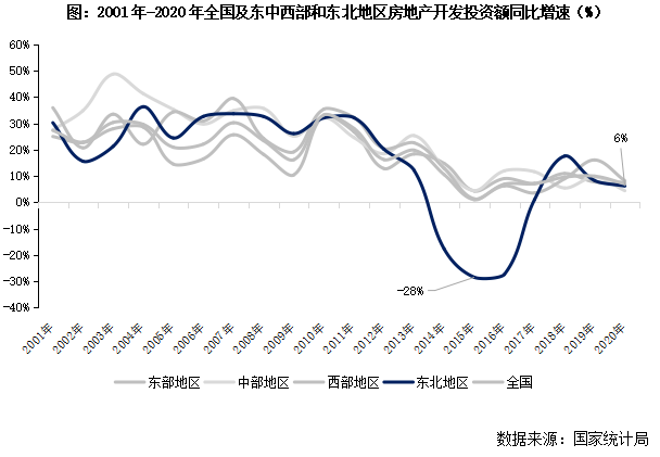 2010年后東北地區(qū),包括遼寧、吉林、黑龍江3省,房地產(chǎn)發(fā)展逐漸偏離全國主航道。不僅開發(fā)投資額增速自2014年以來進(jìn)入負(fù)增長區(qū)間,行業(yè)銷售規(guī)模也常年低于東中西部地區(qū),自2018年起已連續(xù)3年負(fù)增長。