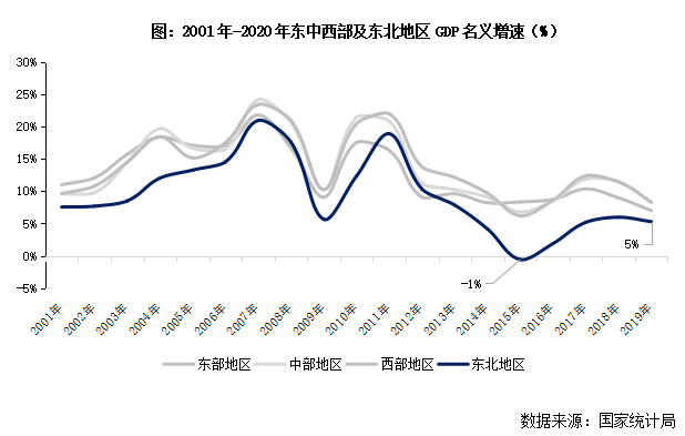 經(jīng)濟(jì)層面,東北地區(qū)GDP增速大幅落后其他地區(qū)。隨著國民經(jīng)濟(jì)的發(fā)展,東北地區(qū)普遍以傳統(tǒng)重工業(yè)為主的第二產(chǎn)業(yè)對整體經(jīng)濟(jì)增長的支撐愈發(fā)有限。隨著地區(qū)資源逐漸枯竭,產(chǎn)能落后下東北地區(qū)GDP名義增速自2012年起逐步下行,2015年甚至同比負(fù)增長1%。至2019年雖有所回升,但GDP名義增速僅5%,大幅落后于東中西部地區(qū)。