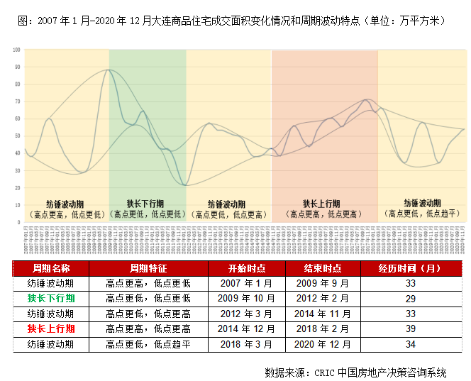 一是紡錘波動期,主要特征為高低點(diǎn)波幅較大,且相鄰高點(diǎn)之間和低點(diǎn)之間并無顯著的上行或下調(diào)趨勢,市場波動持續(xù)加劇。大連樓市成交量在2007年1月-2009年9月、2012年3月-2014年11月、2018年3月-2020年12月皆呈現(xiàn)出此類特征。