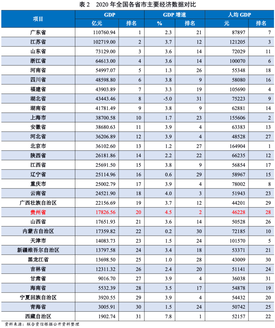 依托豐富的自然資源,貴州省形成了煤、電、煙、酒四大傳統(tǒng)支柱產(chǎn)業(yè),近年來(lái)大力發(fā)展的新興產(chǎn)業(yè)目前規(guī)模相對(duì)較小,經(jīng)濟(jì)新動(dòng)能的培育還需時(shí)日。近年來(lái),貴州省經(jīng)濟(jì)保持增長(zhǎng),經(jīng)濟(jì)總量總體處于全國(guó)中下游水平。新冠疫情對(duì)旅游業(yè)沖擊較大,2020年以來(lái)貴州省經(jīng)濟(jì)增速放緩。