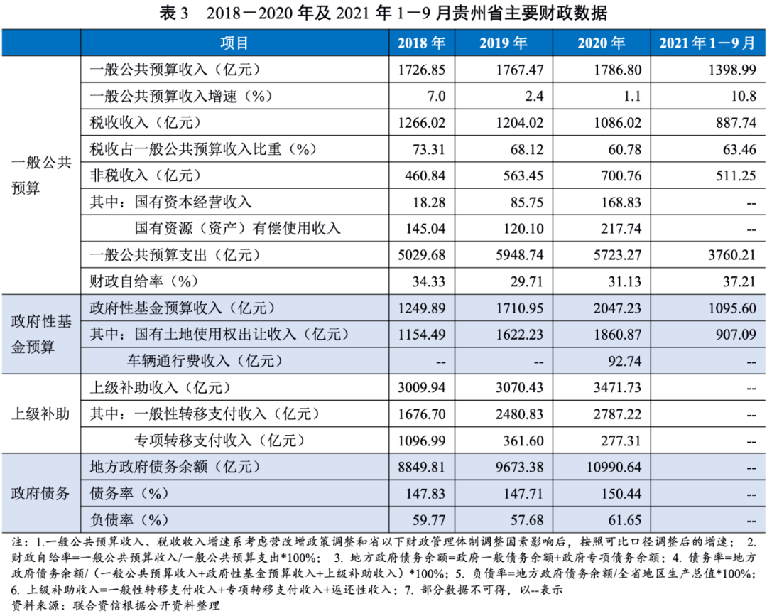 貴州省依托豐富的自然資源,逐漸形成了煤、電、煙、酒四大傳統(tǒng)支柱產(chǎn)業(yè),近年來(lái)大力發(fā)展的新興產(chǎn)業(yè)規(guī)模較小,經(jīng)濟(jì)新動(dòng)能的培育還需時(shí)日。近年來(lái)貴州省經(jīng)濟(jì)保持增長(zhǎng),產(chǎn)業(yè)結(jié)構(gòu)有所改善,經(jīng)濟(jì)總量處于全國(guó)中下游水平。貴州省一般預(yù)算收入保持增長(zhǎng)但增速放緩,稅收收入主要來(lái)自傳統(tǒng)支柱產(chǎn)業(yè),稅源結(jié)構(gòu)較為單一,2020年受減稅降費(fèi)及新冠疫情影響出現(xiàn)下降。政府性基金預(yù)算收入和上級(jí)補(bǔ)助收入占比較高,2021年以來(lái)貴州省部分地區(qū)房地產(chǎn)市場(chǎng)低迷,前三季度基金收入同比下降。與其他省市相比,貴州省政府負(fù)債率和債務(wù)率相對(duì)較高。