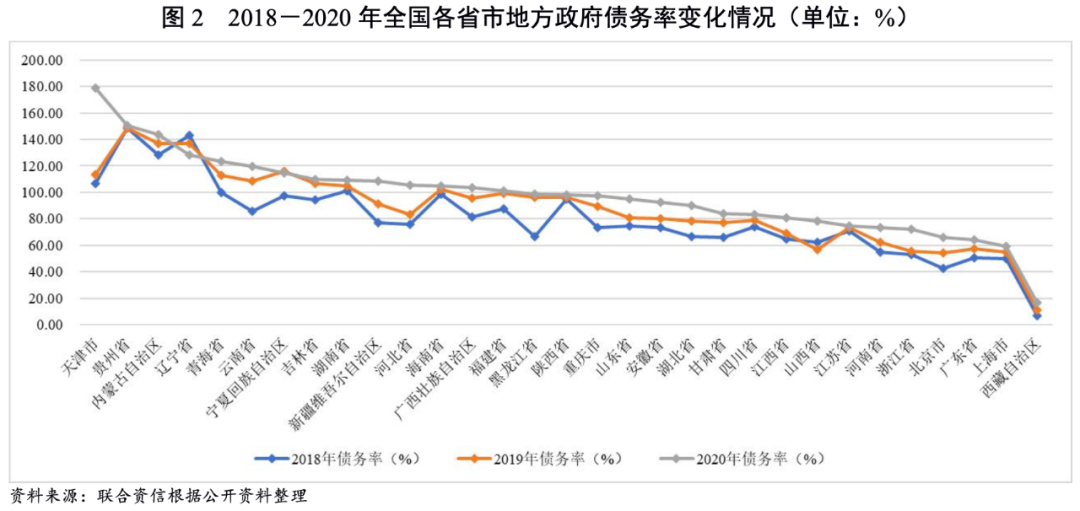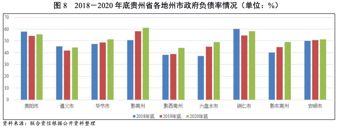 政府負(fù)債率方面,受債務(wù)規(guī)模擴(kuò)大及新冠疫情導(dǎo)致2020年經(jīng)濟(jì)增速下滑雙重因素影響,2020年底,貴州省各地州市政府負(fù)債率均較2019年底小幅上升,其中黔西南州政府負(fù)債率上升5.17個(gè)百分點(diǎn),政府負(fù)債水平有所提高。各地州市2020年底政府負(fù)債率分布在43%~61%之間,其中黔南州最高,黔西南州最低。