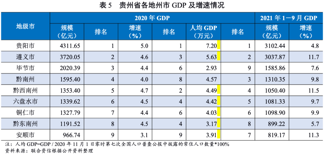 由于貴州省產(chǎn)業(yè)發(fā)展較大程度依賴于自然稟賦,貴州省內(nèi)各地州市經(jīng)濟(jì)發(fā)展水平相對(duì)不均衡。貴州省所轄的六市三州中,貴陽(yáng)市第三產(chǎn)業(yè)占比較高(59.90%),2020年GDP總量及增速指標(biāo)位列第一。貴陽(yáng)市和遵義市經(jīng)濟(jì)總量較為接近,為全面提升省會(huì)城市經(jīng)濟(jì)首位度,2021年4月,貴陽(yáng)市政府印發(fā)《貴陽(yáng)市實(shí)施“強(qiáng)省會(huì)”五年行動(dòng)方案》,旨在通過大數(shù)據(jù)引領(lǐng)創(chuàng)新發(fā)展、貴陽(yáng)貴安深度融合等多方面舉措提升貴陽(yáng)市城市能級(jí),到2025年貴陽(yáng)市地區(qū)GDP達(dá)7000億元以上,經(jīng)濟(jì)總量在全國(guó)省會(huì)城市位次前移,首位度[1]達(dá)27%以上(2020年為24.2%)。2021年前三季度,貴陽(yáng)市主力的第二產(chǎn)業(yè)和第三產(chǎn)業(yè)增長(zhǎng)放緩,固定資產(chǎn)投資同比下降16.8%,GDP增速在各地州市中排名靠后,未來(lái)面臨一定增長(zhǎng)壓力。