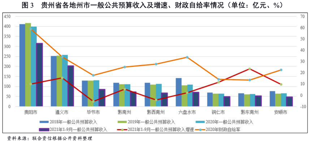 各地州市中,貴陽(yáng)市和遵義市財(cái)政實(shí)力較強(qiáng),一般公共預(yù)算收入質(zhì)量較好,其中貴陽(yáng)市財(cái)政自給率最高,政府綜合財(cái)力近一半由政府性基金預(yù)算收入貢獻(xiàn),政府債務(wù)負(fù)擔(dān)較重;其余地州市財(cái)政自給率較低,對(duì)上級(jí)補(bǔ)助收入依賴大。