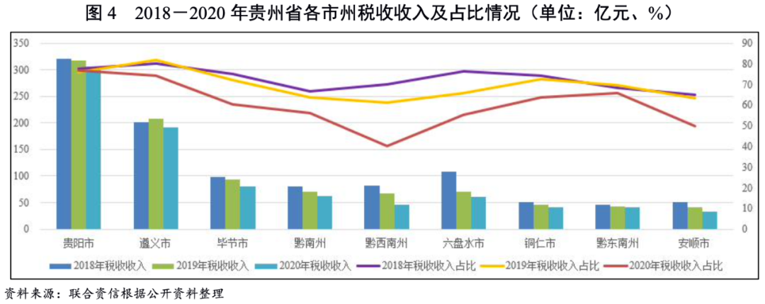 受經(jīng)濟(jì)發(fā)展水平及區(qū)域內(nèi)主導(dǎo)產(chǎn)業(yè)發(fā)展等因素影響,貴州省各地州市一般公共預(yù)算收入明顯分化。貴陽(yáng)市和遵義市處于第一梯隊(duì),近三年一般公共預(yù)算收入規(guī)模分別在400億元和260億元上下浮動(dòng)。從2020年變化情況看,因新冠疫情導(dǎo)致第三產(chǎn)業(yè)減收幅度較大加之2019年存在一次性稅收收入,2020年貴陽(yáng)市一般公共預(yù)算收入小幅下降4.59%。減稅降費(fèi)疊加新冠疫情影響,2020年遵義市增值稅減收明顯,進(jìn)而導(dǎo)致全年稅收收入下降7.9%。各地州市中,貴陽(yáng)市和遵義市的稅收收入占比最高,在70%~80%之間。