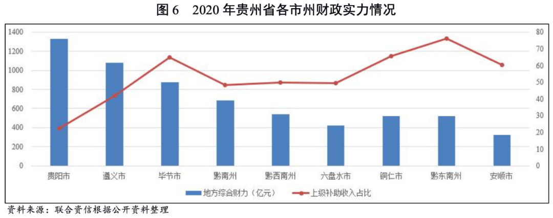 從綜合財(cái)政實(shí)力看,貴陽(yáng)市和遵義市綜合財(cái)力2020年分別為1326.62億元和1081.33億元,安順市綜合財(cái)力規(guī)模最小,為322.61億元。除貴陽(yáng)市外,貴州省其余地州市2020年上級(jí)補(bǔ)助收入在綜合財(cái)力中所占的比重超過40%,對(duì)上級(jí)補(bǔ)助依賴較大。