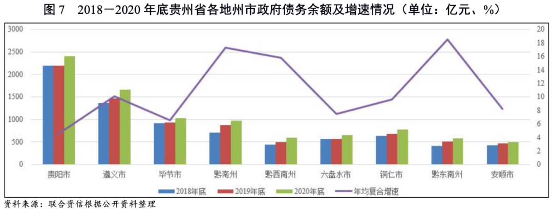 從存量政府債務(wù)規(guī)模看,貴州省各地州市中,貴陽(yáng)市政府債務(wù)余額遠(yuǎn)高于其余地州市,2020年底為2397.23億元;其次為遵義市(1654.68億元)。從政府債務(wù)增速看,2018-2020年底,貴州省各地州市政府債務(wù)余額均呈上升趨勢(shì),其中黔東南州、黔南州和黔西南州債務(wù)增速較快,年均復(fù)合增速在15%~19%之間。
