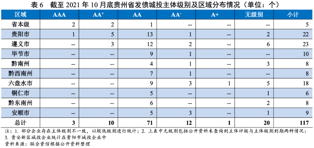 截至2021年10月底,貴州省內(nèi)存續(xù)發(fā)債城投企業(yè)共117家,其中省級(jí)5家、市州級(jí)42家、區(qū)縣級(jí)58家、園區(qū)級(jí)12家。從區(qū)域分布看,貴陽(yáng)市、遵義市和六盤水市為發(fā)債城投數(shù)量最多的三個(gè)地州市,其城投企業(yè)數(shù)量約占貴州省整體的53.85%。從級(jí)別分布看,貴州省城投企業(yè)主體級(jí)別以AA為主(占59.83%),AA+及以上級(jí)別城投企業(yè)約占11.11%,主要為省本級(jí)、貴陽(yáng)市及遵義市的市州級(jí)城投企業(yè)。