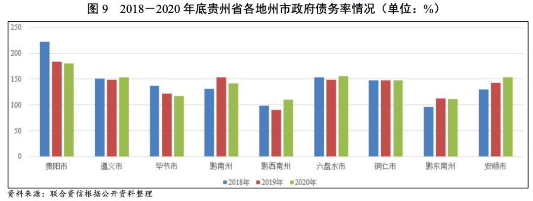 截至2020年底,貴陽(yáng)市政府債務(wù)率最高(180.70%),六盤水市、安順市和遵義市政府債務(wù)率在153%~157%之間,黔西南州政府債務(wù)率最低(109.89%)。從變化看,貴陽(yáng)市和畢節(jié)市政府債務(wù)率逐年下降,除兩者均為政府債務(wù)增速最低的地州市外,貴陽(yáng)市主要受益于政府性基金預(yù)算收入規(guī)模的擴(kuò)張,畢節(jié)市主要受益于上級(jí)補(bǔ)助收入的增長(zhǎng)。綜合財(cái)力下降疊加債務(wù)規(guī)模增長(zhǎng)影響下,安順市政府債務(wù)率2020年較2018年上升23.89個(gè)百分點(diǎn)。
