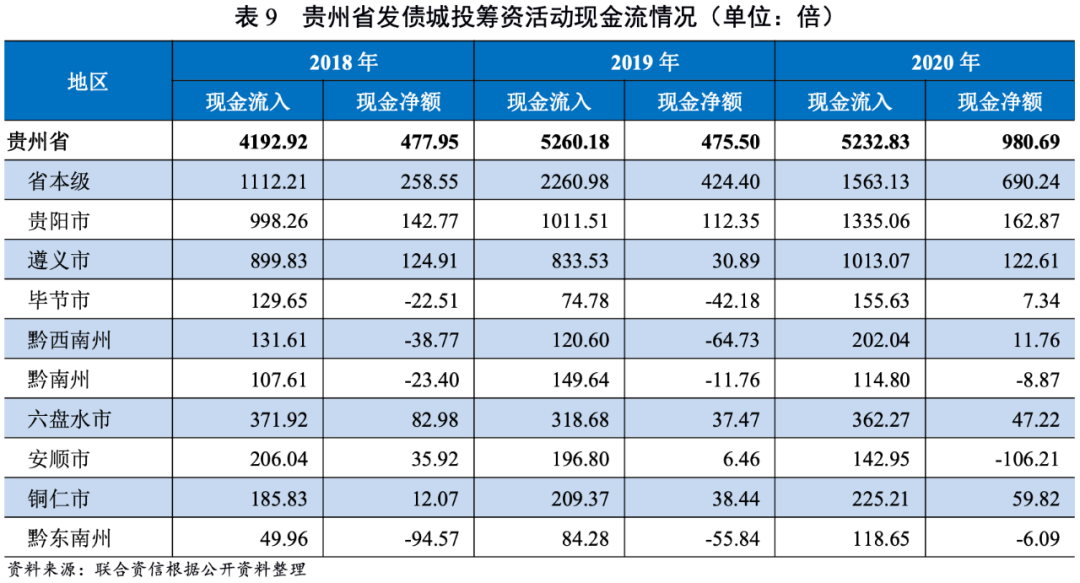 從發(fā)債城投籌資活動(dòng)現(xiàn)金流看,2018-2020年,貴州省發(fā)債城投籌資活動(dòng)現(xiàn)金凈流入規(guī)模波動(dòng)上升,2020年受益于寬松的貨幣政策,貴州省城投企業(yè)籌資活動(dòng)現(xiàn)金凈流入規(guī)模擴(kuò)大。其中,安順市、黔南州和黔東南州發(fā)債城投籌資活動(dòng)呈凈流出,與同期債務(wù)規(guī)模變化趨勢(shì)一致;貴陽(yáng)市、遵義市、六盤水市和銅仁市城投企業(yè)籌資活動(dòng)呈凈流入。2020年籌資活動(dòng)凈流入規(guī)模看,省本級(jí)、貴陽(yáng)市和遵義市為凈流入規(guī)模最大的三個(gè)區(qū)域,其余地州市凈流入規(guī)模較小或呈凈流出。