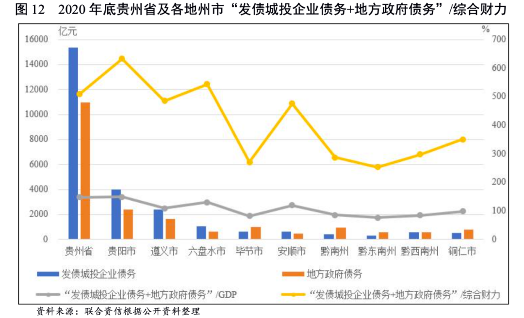 貴州省發(fā)債城投企業(yè)債務(wù)總額高于地方政府債務(wù)余額,地方綜合財(cái)力對(duì)“發(fā)債城投企業(yè)債務(wù)+地方政府債務(wù)”的保障程度整體較低。