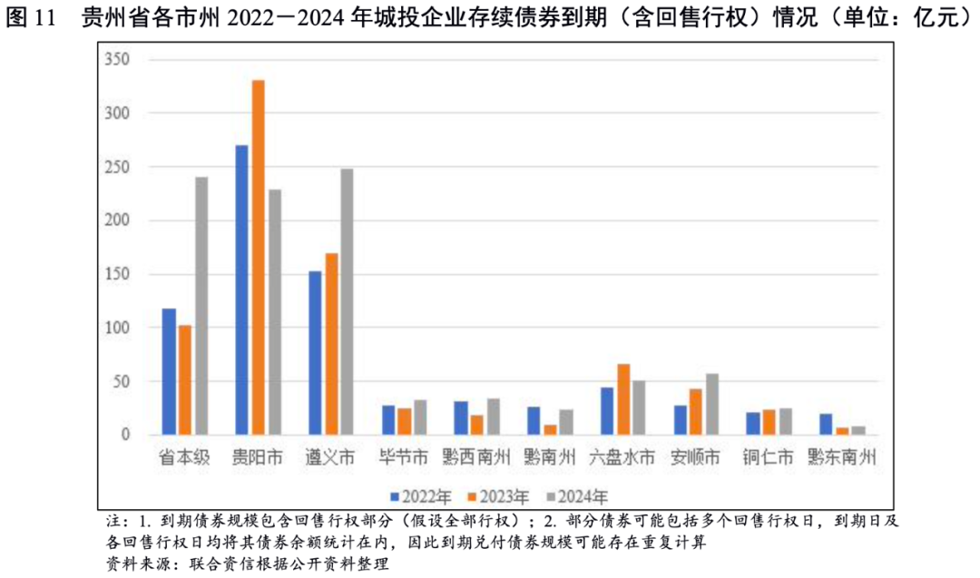 從未來(lái)三年債券到期分布看,貴陽(yáng)市2022-2023年到期兌付債券(含回售行權(quán),下同)規(guī)模較大,分別約270億元和330億元,省本級(jí)及遵義市2024年到期債券規(guī)模相對(duì)較大,其余地州市到期債券規(guī)模相對(duì)較小。